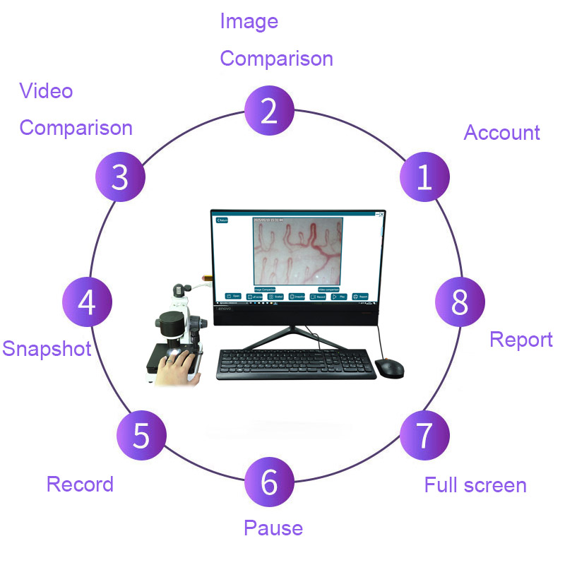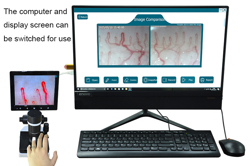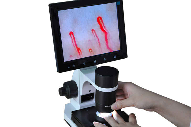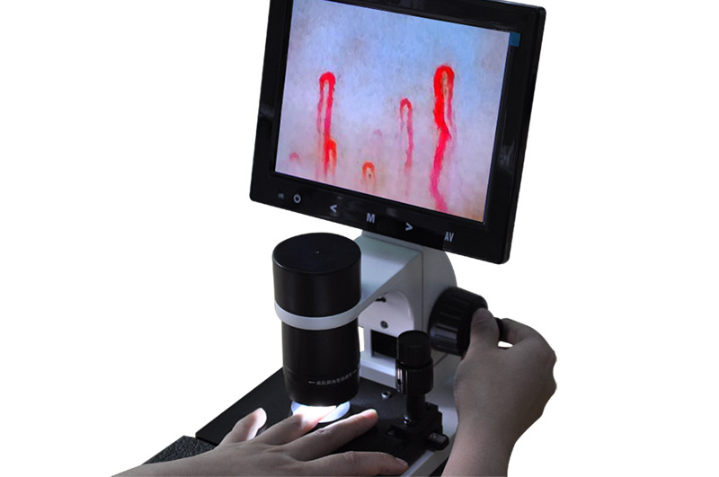 HT-WXHP Microcirculation detector with HD 8-inch displayA circulation detector is a device that detects microcirculation in the nail folds (just below the tip of the ring finger), Visualizing blood flow and blood vessel shape on an 8-inch high-definition display, A physician or hygienist determines a healthy or abnormal state of the body based on observations. Products are used in medical institutions, specialized clinics, beauty salons, beauty chain institutions, Cosmetics distribution sales, beauty products distribution sales, health products distribution sales and so on.