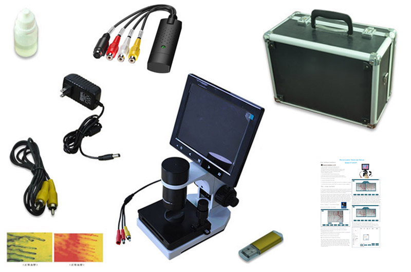 Product parameters: Model.: HT-WXHP ( Video microcirculation detector) Controller:: dedicated main control DSP Magnification: 400X Light Source: built-in high-brightness white LED light Camera: 1/4 Screen: 8 inches Backlight thickness: 5.5mm Resolution: 800x600 Brightness: 400 Viewing angle: 60/60/60/60 Imaging distance: Manual adjustment 0~40mm Support O/S : WIN XP/;WIN 7, WIN 8, WIN 10(PC) Software:Hotwxh_Installation Connection method: AV interface Power supply: USB (12V DC) Product color: black and white Main body size: 21cm (L)* 13cm (W)* 22cm (H) Package weight: 4.5 kg